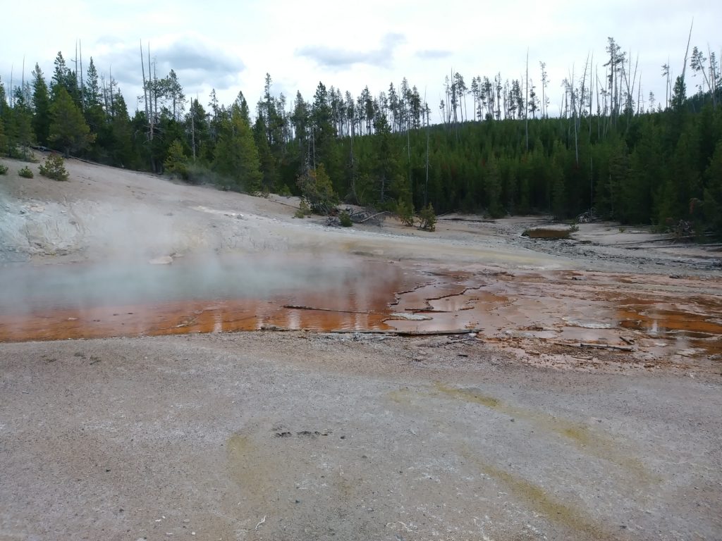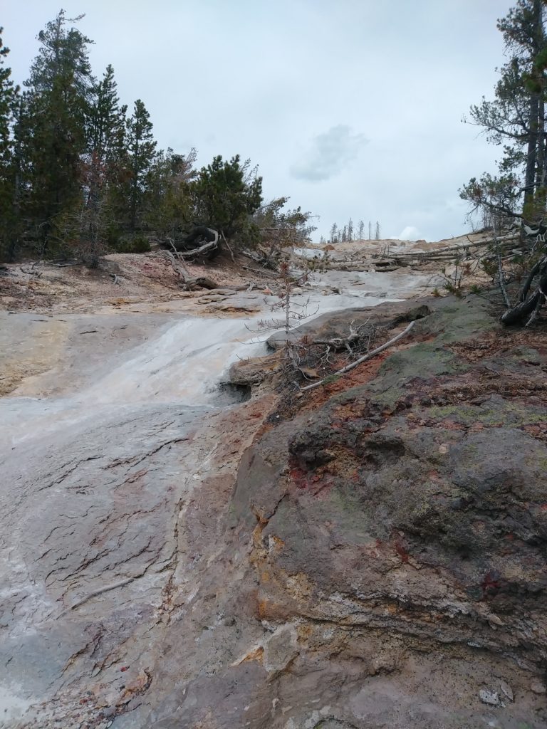 Well, you hurry through that and get back into the forest. I was so grateful for the scent of trees and their healthier energy- but even these struggle to grow in such an unfriendly place. The forest floor is carpeted with the lodgepole pines that’ve tapped out; the ones that only half fall to the ground, and instead get hung up on their living brethen, give unnerving groans every time the wind stirs them. The streams were so noisome and mephitic that I positively refused to get my boots wet when I crossed. I was afraid the soles would get eaten off by acid or something.