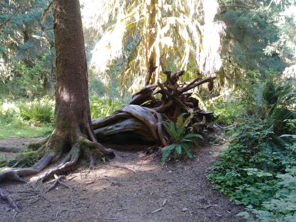 About 80% of fallen trees in the Olympic rainforest are taken out by wind. Ever heard that adage about plants going as far into the earth as they grow up into the sky? It apparently doesn’t apply here; the trees have surprisingly shallow root systems and this makes them prone to wind damage. Aside from acting as nurse logs for new trees, the downed trees also foster an interesting variety of fungi and… stuff.
