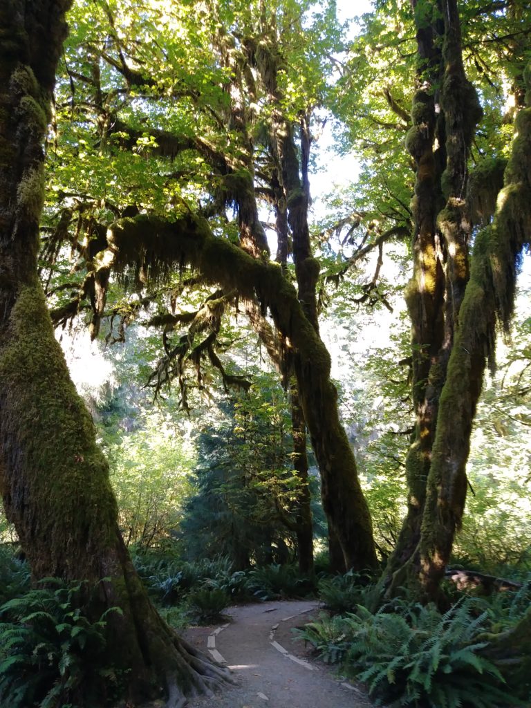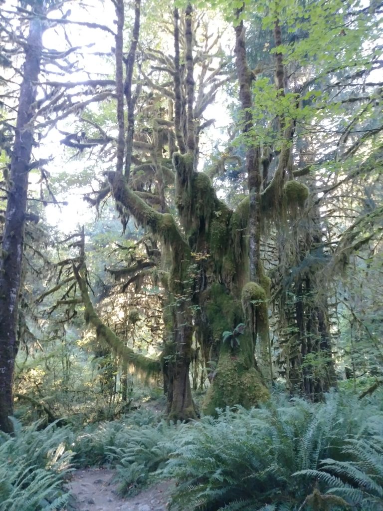 The western slopes of the Olympic Mountains receive about 12 feet of rain every year. Thus, it has a rainforest. In contrast, the eastern side (in the “rain shadow”) gets less than 20 inches in a year. I was there during the dry season, and, thus, got a rather lovely look at the sun filtering through.
