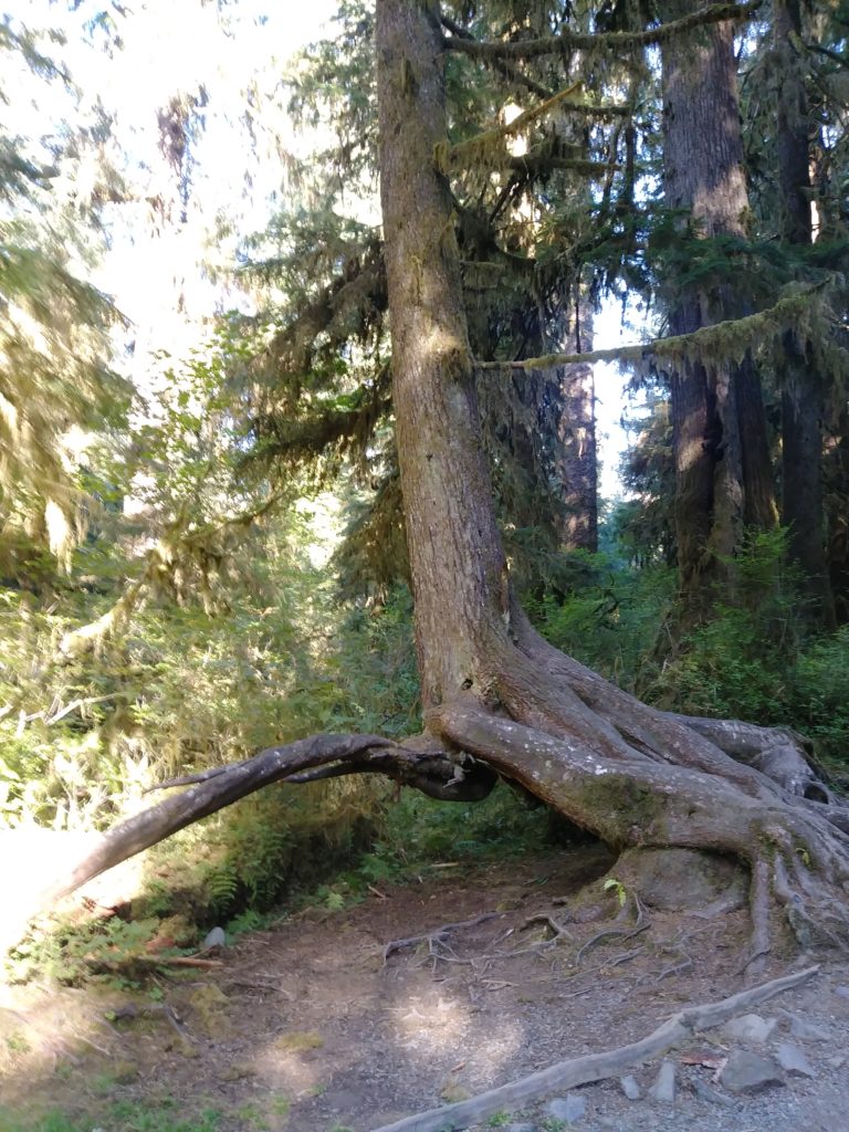 See how thickly green things are growing on the forest floor? It’s nearly impossible for a tree to get a start in life due to all the competition. Generally, new trees only have an opportunity to grow atop old dead trees- a fascinating circle of life. The dead trees are called nurse logs. They gradually decay, but the seedlings they nurtured continue to grow in the shape dictated by their nurse logs, which results is absolutely fascinating above-ground root systems. So the images above demonstrate a tree growing on a stump that hasn’t rotted away yet. Below is a tree whose nurse log is long gone, and appears to have two legs because of that.